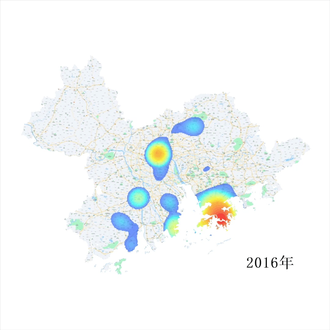 從2016至今,即使相隔珠江口,大灣區(qū)區(qū)域顏色不斷加深,各熱點之間聯(lián)系更加緊密。