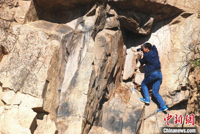 資料圖。圖為2018年,包金泉在科右中旗杜爾基鎮(zhèn)衙門(mén)毛杜嘎查境內(nèi),采集畢其格哈達(dá)題記內(nèi)容?!】朴抑衅煳奈锟脊叛芯克﹫D