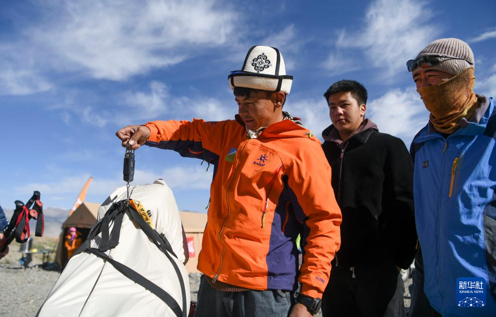 7月4日,在新疆慕士塔格峰一處登山營地,塔西巴伊(左)將登山者的物品稱重。高山搬運(yùn)依據(jù)不同海拔路程對所背物品按重量收取費(fèi)用。新華社記者 胡虎虎 攝