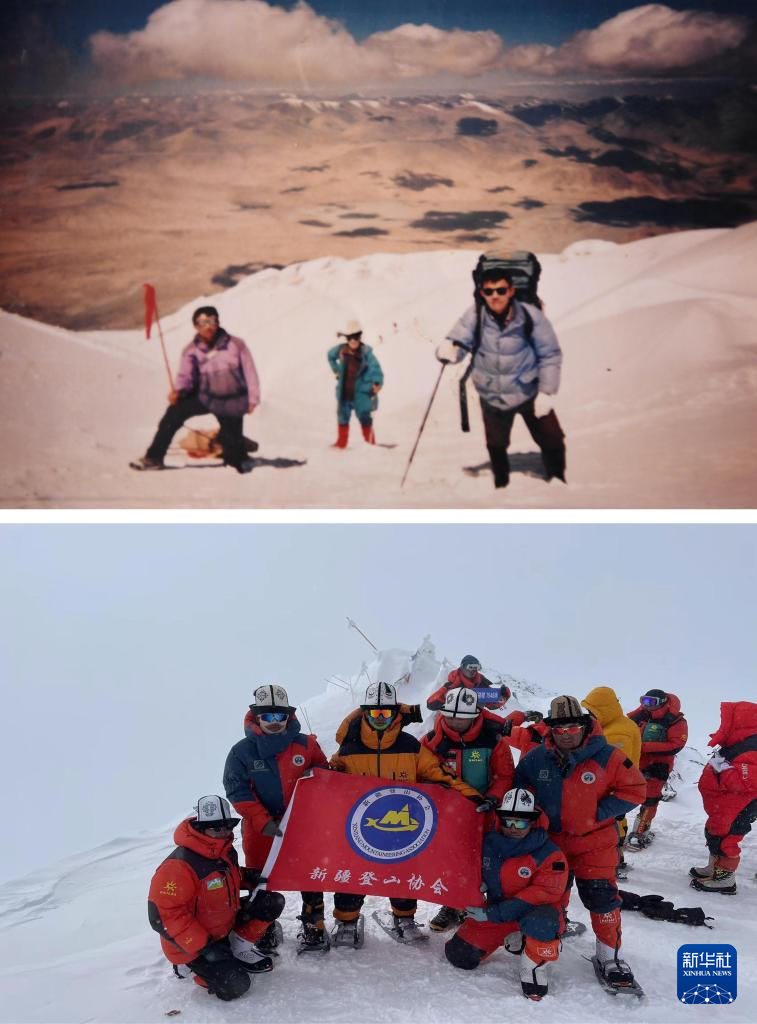 拼版照片:上圖為父親加尼拜克(左)與其兄弟于2004年8月6日一起為國外登山隊(duì)服務(wù)時在慕士塔格峰上的合影(2024年7月5日翻拍資料照片,新華社記者胡虎虎攝);下圖為兒子塔西巴伊(左三、黃衣者)和同伴于2023年7月29日登頂慕士塔格峰時的合影(受訪者供圖)。新華社發(fā)