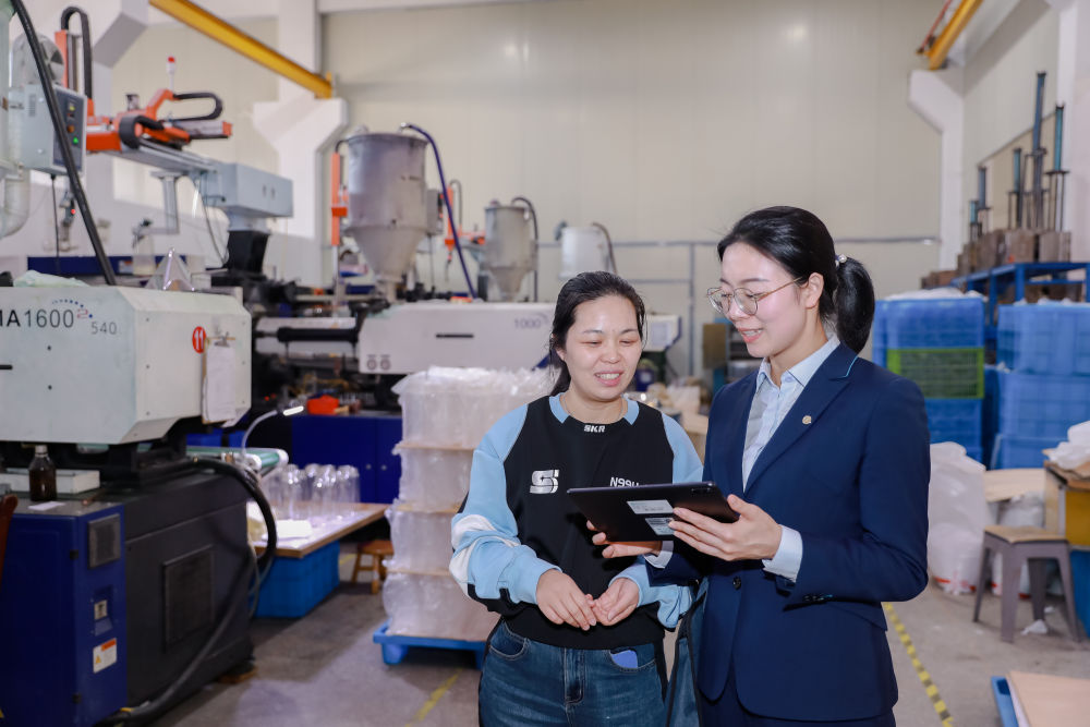 2023年11月,臺(tái)州銀行信貸經(jīng)理(右)在黃巖走訪小微企業(yè)。新華社發(fā)