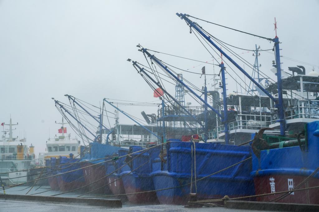 7月25日下午,在位于福建省莆田市秀嶼區(qū)埭頭鎮(zhèn)的石城國家一級漁港,今年第3號臺風(fēng)“格美”的外圍風(fēng)圈已經(jīng)襲來。七八級的陣風(fēng)夾雜著豆大的雨點打在臉上,裹挾著三四米高的海浪拍擊著護堤,激起白茫茫一片水花。漁港里,100多艘大小船舶已在24日中午12點前回港,呈“半月環(huán)抱”狀整齊停泊,船舶間已用纜繩加固。
