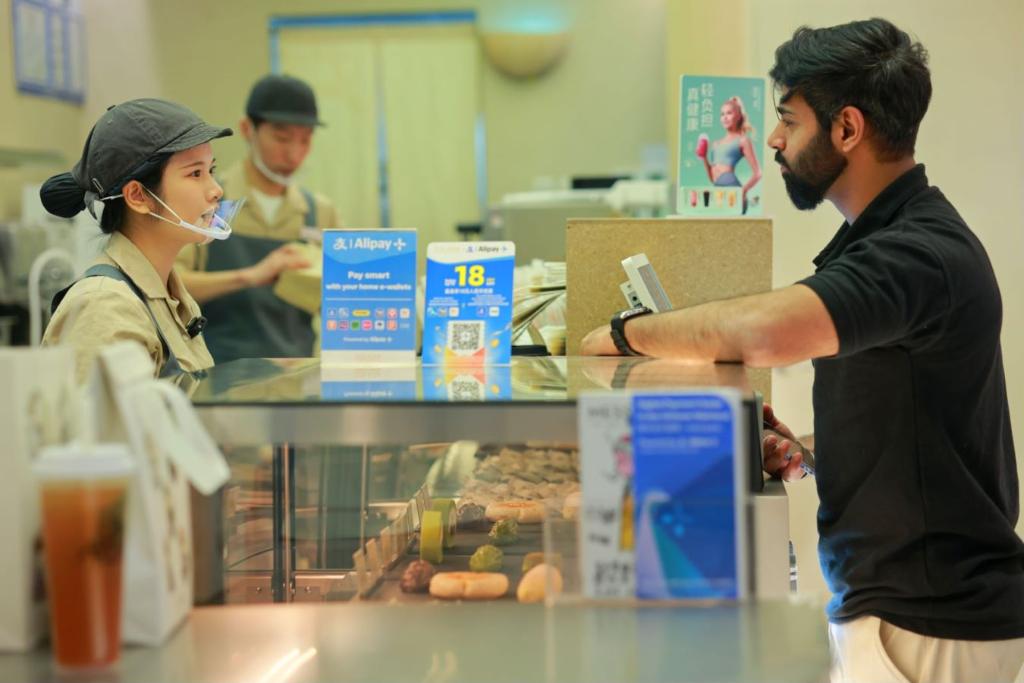 4月8日拍攝的巴基斯坦人冉納在北京藍(lán)色港灣一家飲品店用手機(jī)掃碼支付購(gòu)買(mǎi)商品。新華社發(fā)