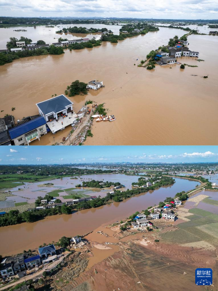 拼版照片:上圖為7月29日12時拍攝的湖南省湘潭縣易俗河鎮(zhèn)四新堤決口現(xiàn)場(無人機(jī)照片);下圖為7月30日16時拍攝的湖南省湘潭縣易俗河鎮(zhèn)四新堤決口現(xiàn)場(無人機(jī)照片)。新華社記者 陳思汗 攝