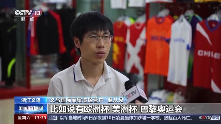 義烏國際商貿(mào)城經(jīng)營戶 溫從見:今年因?yàn)槭鞘澜绱筚惸辏热缯f有歐洲杯、美洲杯、巴黎奧運(yùn)會,差不多3月份開始,我們就已經(jīng)著手開始接單、打樣、生產(chǎn)這一系列的運(yùn)動服飾。我們總共3個賽事下來銷了30萬件左右。