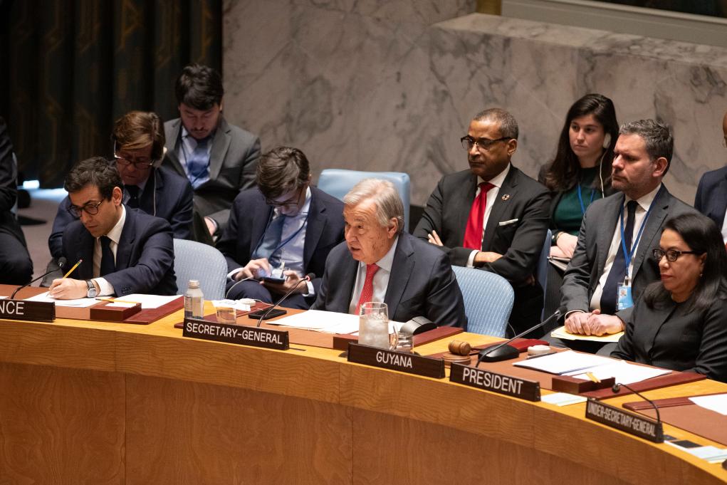 2月23日,在位于紐約的聯(lián)合國(guó)總部,聯(lián)合國(guó)秘書(shū)長(zhǎng)古特雷斯(前排中)在烏克蘭問(wèn)題高級(jí)別公開(kāi)會(huì)上發(fā)言。烏克蘭危機(jī)升級(jí)兩周年之際,聯(lián)合國(guó)安理會(huì)23日舉行烏克蘭問(wèn)題高級(jí)別公開(kāi)會(huì),與會(huì)多方呼吁通過(guò)政治手段解決烏克蘭危機(jī)。新華社記者謝鍔攝