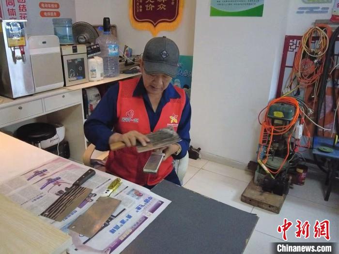 日前,“鑄牢共同體 中華一家親”主題宣傳“塞上江南寫新篇”集中采訪團走進寧夏銀川市金鳳區(qū)黃河東路街道的頤和城府社區(qū)。圖為智福德正在為社區(qū)居民打磨刀具。中新網記者 劉玥晴 攝