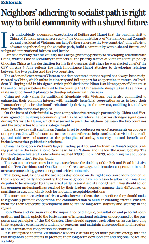此次訪華是蘇林自8月3日當選越共中央總書記以來的首次外訪,彰顯了越方對發(fā)展兩黨兩國關系的高度重視。對于越方展現(xiàn)出的熱情與誠意,中方給與積極回應,全力支持雙方合作。
