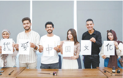 7月3日,埃及中國(guó)圖書(shū)中心揭牌儀式在埃及開(kāi)羅巴德?tīng)柎髮W(xué)舉辦。圖為參加活動(dòng)的埃及大學(xué)生展示書(shū)法。