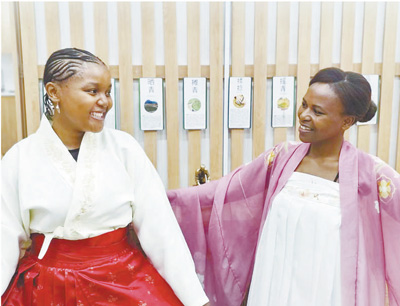 當(dāng)?shù)貢r(shí)間4月20日,為慶祝第十五個(gè)聯(lián)合國(guó)中文日,南非德班理工大學(xué)孔子學(xué)院舉辦以“說(shuō)文解字,以茶會(huì)友”為主題的活動(dòng)?;顒?dòng)參與者身穿中國(guó)傳統(tǒng)服飾,共同探討漢字和茶文化。圖為兩名當(dāng)?shù)嘏⒃嚧┲袊?guó)傳統(tǒng)服飾。