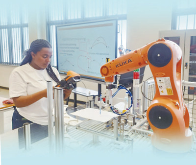 埃塞俄比亞魯班工坊由天津職業(yè)技術(shù)師范大學(xué)與埃塞聯(lián)邦職業(yè)技術(shù)培訓(xùn)學(xué)院合作建立,于2021年4月揭牌啟運(yùn),聚焦人工智能領(lǐng)域,對(duì)接當(dāng)?shù)睾献髟盒5碾姎庾詣?dòng)化與控制技術(shù)管理等專(zhuān)業(yè)。圖為當(dāng)?shù)貙W(xué)生在操作工業(yè)機(jī)器人。