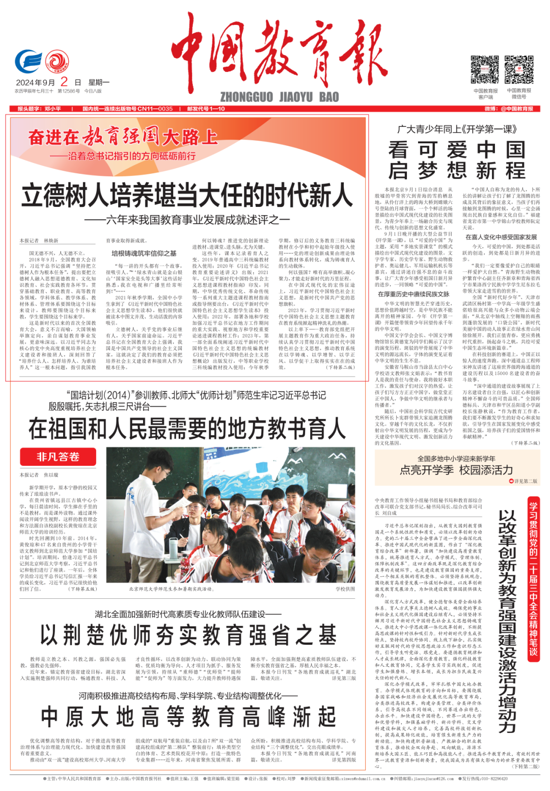 到2035年建成教育強(qiáng)國(guó),是黨中央作出的重要決策部署,是習(xí)近平總書記念茲在茲、殷切期盼的“國(guó)之大者”。教育系統(tǒng)牢記囑托,砥礪奮進(jìn),奮力書寫教育強(qiáng)國(guó)建設(shè)支撐引領(lǐng)中國(guó)式現(xiàn)代化的新篇章。日前,教育部新媒體矩陣推出“奮進(jìn)在教育強(qiáng)國(guó)大路上——沿著總書記指引的方向砥礪前行”專欄,展示教育系統(tǒng)加快建設(shè)教育強(qiáng)國(guó)的生動(dòng)實(shí)踐。