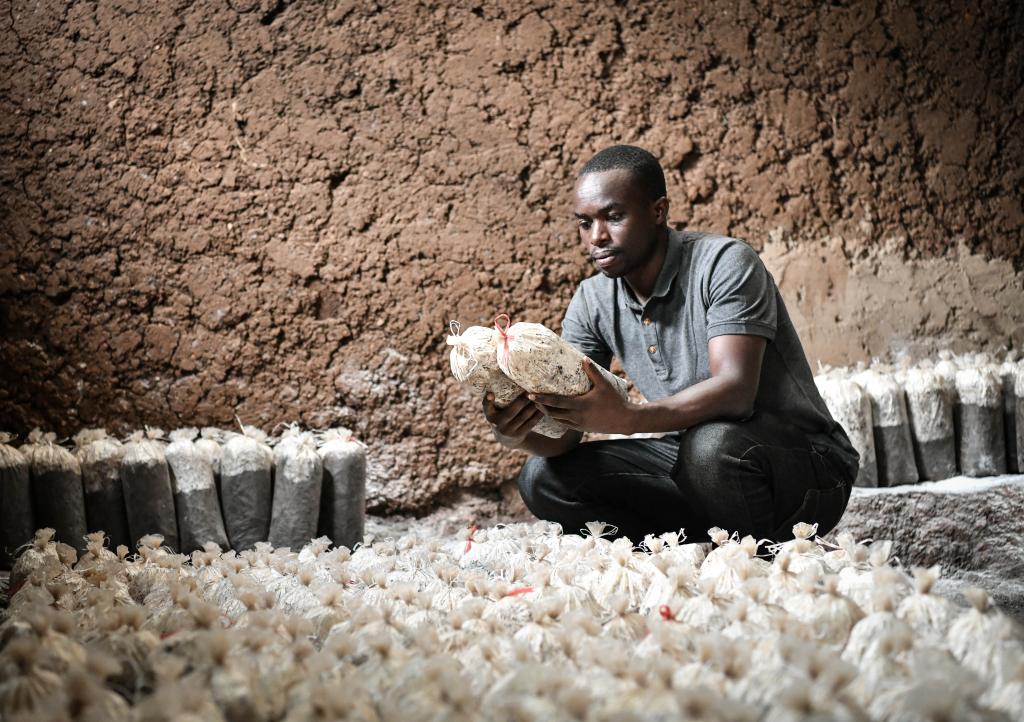 8月14日,在盧旺達南方省穆漢加區(qū),尼揚博·奧貝德在食用菌培育工坊內檢查菌袋。曾兩次赴中國進行菌草技術培訓的尼揚博·奧貝德在南方省和東方省各擁有一家工坊。