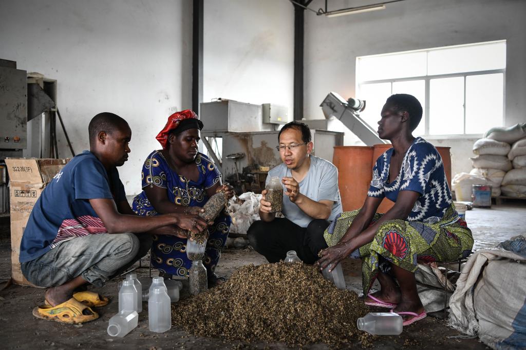 8月13日,在盧旺達南方省胡耶區(qū)的中國援盧農業(yè)技術示范中心,菌草專家陳曉斌(右二)與當?shù)剞r民一起制作菌種培養(yǎng)料。