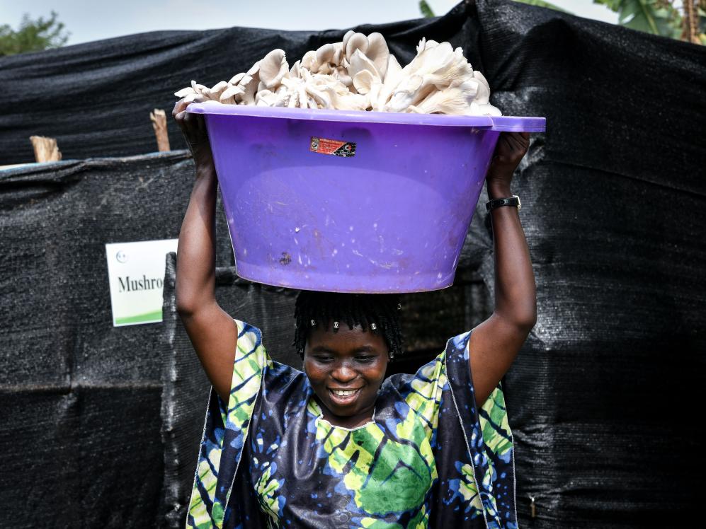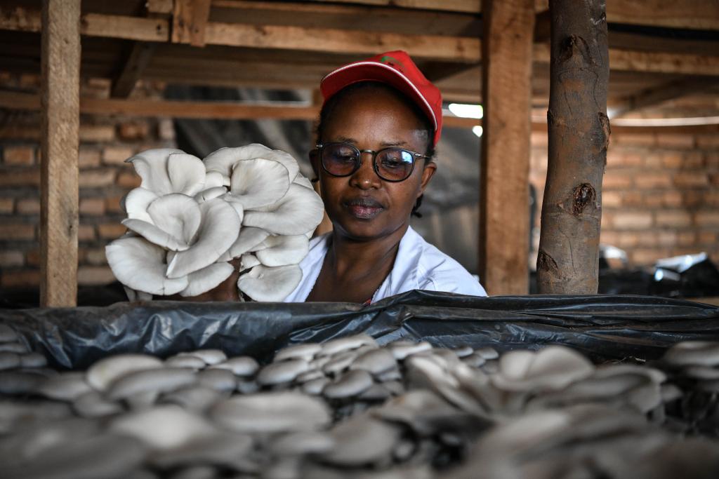 8月15日,在盧旺達首都基加利,蘇珊娜·尼庫澤在自己的菇棚內采摘鮮菇。