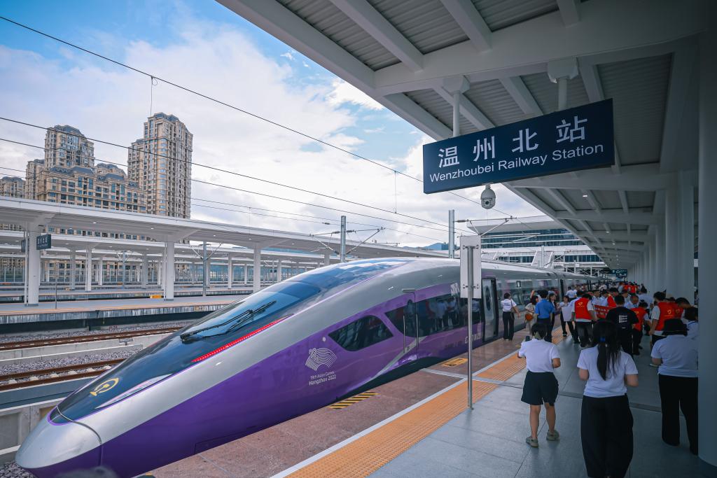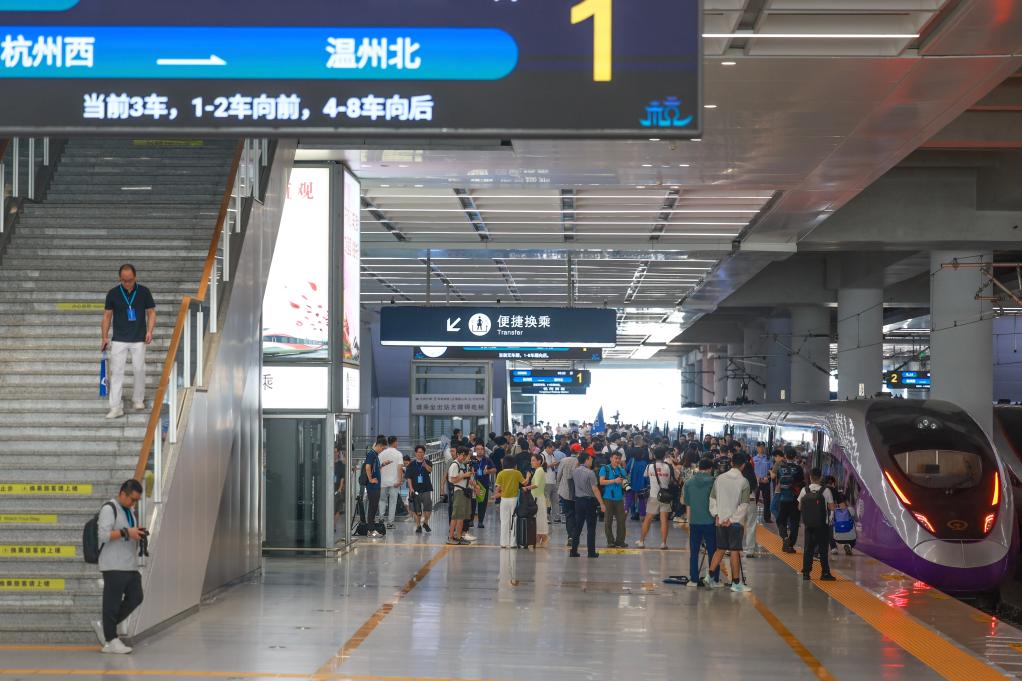 9月6日,從杭州西站開(kāi)出的首發(fā)列車抵達(dá)溫州北站。新華社記者 江漢 攝