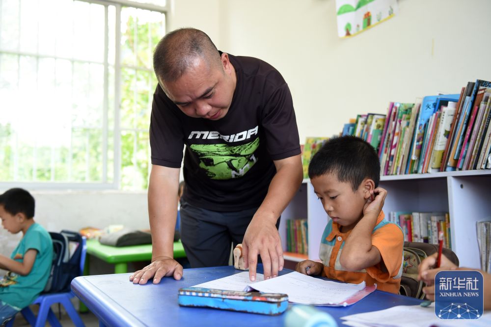 在廣西天等縣龍茗鎮(zhèn)東南村煙屯教學點,“80后”老師董祥在輔導學生功課(2015年6月23日攝)。
