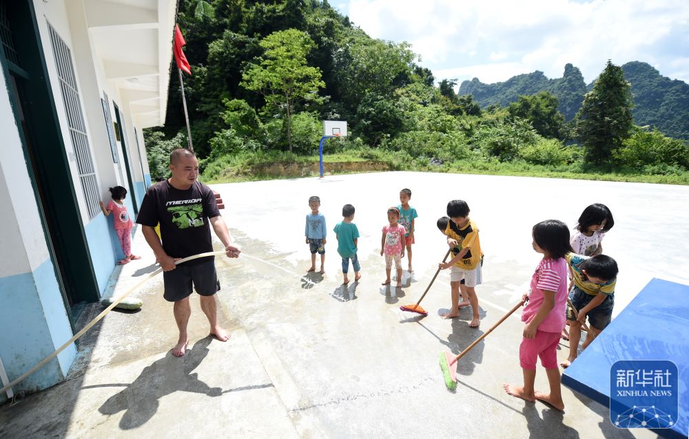 在廣西天等縣龍茗鎮(zhèn)東南村煙屯教學點,“80后”老師董祥在和學生一起做衛(wèi)生(2015年6月23日攝)。
