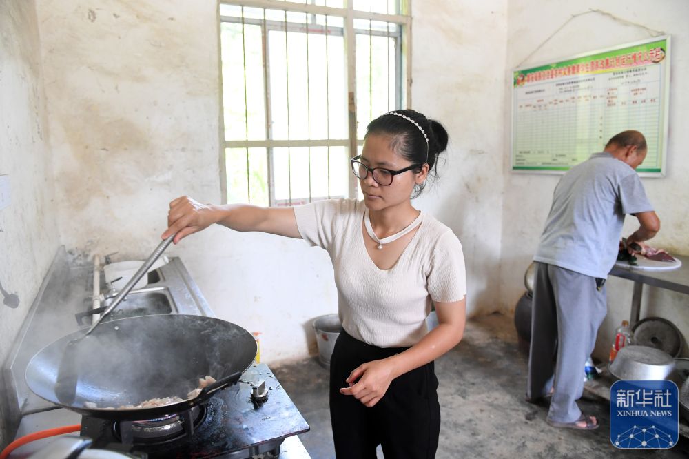 在廣西都安瑤族自治縣龍灣鄉(xiāng)琴棋小學,“85后”老師藍巧春(左)在給學生做午飯(2017年8月31日攝)。