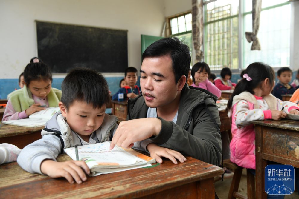 在廣西富川瑤族自治縣新華鄉(xiāng)湖廣小學,“90后”老師謝其鶴在輔導學生功課(2019年3月20日攝)。