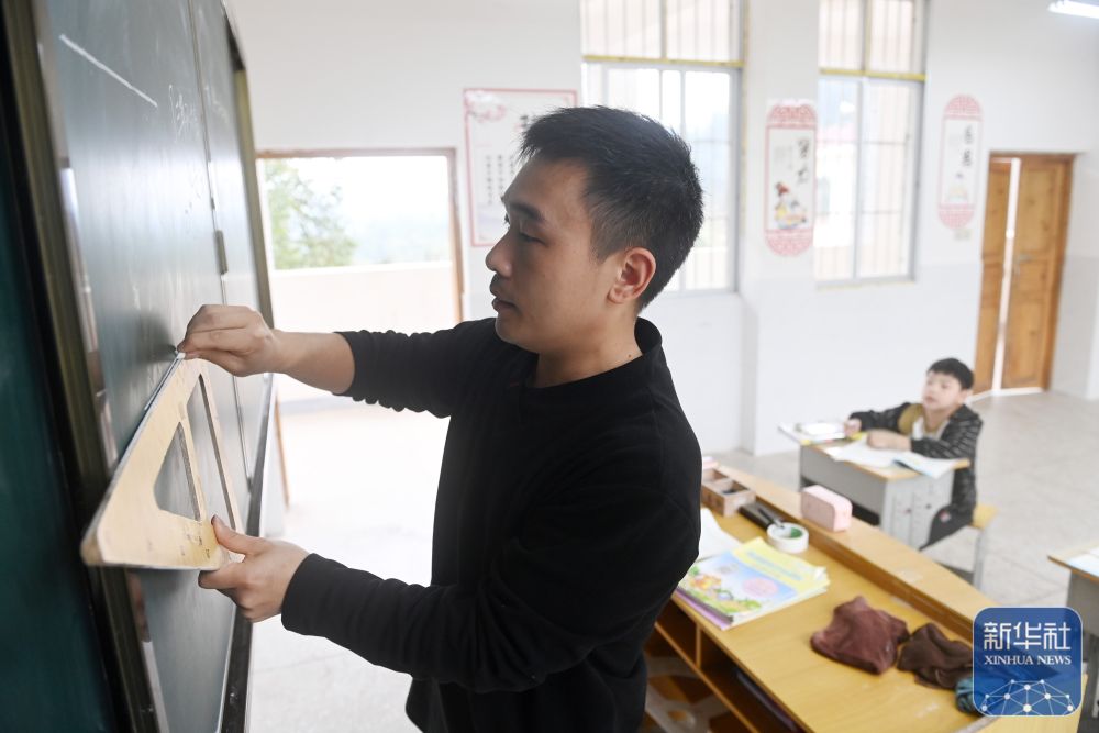 在廣西灌陽縣洞井瑤族鄉(xiāng)野豬殿小學,“85后”老師李清東在給學生上課(2024年3月27日攝)。