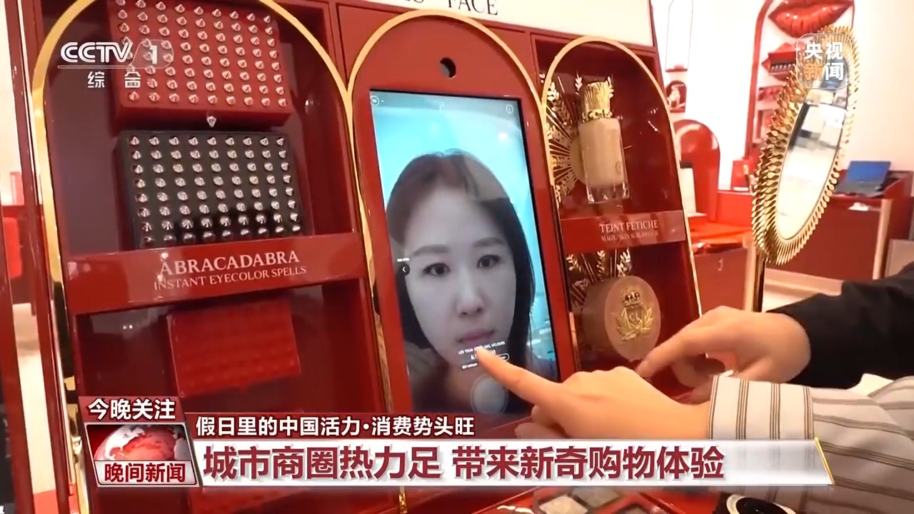 在四川成都,一家大型商場的裸眼3D大屏換上了國慶新裝,身臨其境的原始森林、被滿天繁星包裹,吸引了許多游客前來打卡?,F(xiàn)場更有虛擬試妝、虛擬試鞋、智能導購等等前沿科技帶來的新奇購物體驗。