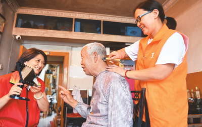 河南省洛陽市澗西區(qū)積極構建“嵌入式”養(yǎng)老服務體系,為老年人提供養(yǎng)老助餐、社區(qū)娛樂、健康管理、上門保潔等綜合養(yǎng)老服務項目,讓老人在家門口享受全方位養(yǎng)老。圖為澗西區(qū)武漢路街道秦嶺路社區(qū),養(yǎng)老服務中心護理員和社區(qū)志愿者為居家老人理發(fā)。黃政偉攝(人民視覺)