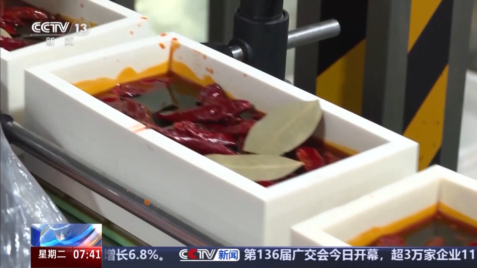 記者在車間里看到,僅僅是一顆小小的辣椒,就要經(jīng)過風選、色選、X光透視篩選等五級智能把關(guān)。隨后它們和花椒等香辛料一起,被送進了這個大容器里。工作人員把配方信息輸入系統(tǒng)后,設備開始自動配料、上料、加工生產(chǎn)。
