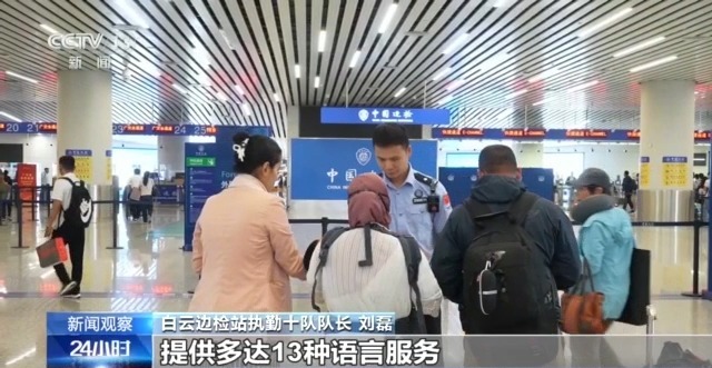 白云邊檢站執(zhí)勤十隊隊長 劉磊:現(xiàn)場這邊的8條通道設置為廣交會專用通道,包括從廊橋到通道前,全程都設置了指引標志和引導民警,提供多達13種語言服務。