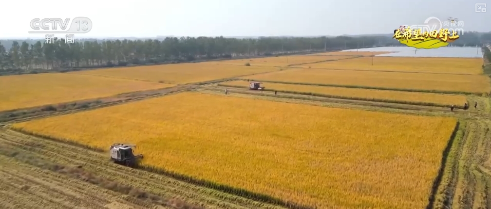 這是臺兒莊的一處水稻種植基地,田野上稻浪滾滾,收割機在地里大顯身手,運糧車跟隨在一旁協(xié)同作業(yè)。