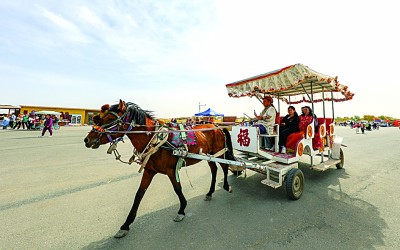 游客在尉犁縣羅布人村寨乘坐馬車。汪志鵬攝