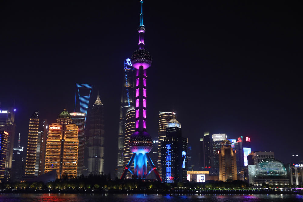 11月3日,位于上海陸家嘴的東方明珠廣播電視塔和大樓亮起主題燈光,迎接第七屆中國國際進(jìn)口博覽會(huì)開幕。