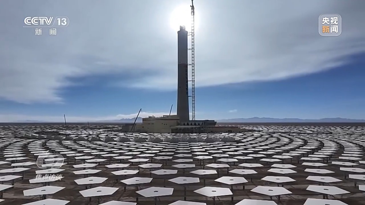 電站通過高精度智能定日鏡,實時跟蹤太陽的運(yùn)動,將太陽直接輻射光反射聚集到吸熱塔上,將吸熱塔內(nèi)的熔鹽加熱到560多℃的高溫,將高溫的熔鹽進(jìn)行儲存,在需要發(fā)電時再通過高溫熔鹽與水進(jìn)行熱交換,產(chǎn)生高溫高壓的蒸汽,驅(qū)動汽輪發(fā)電機(jī)組發(fā)電。