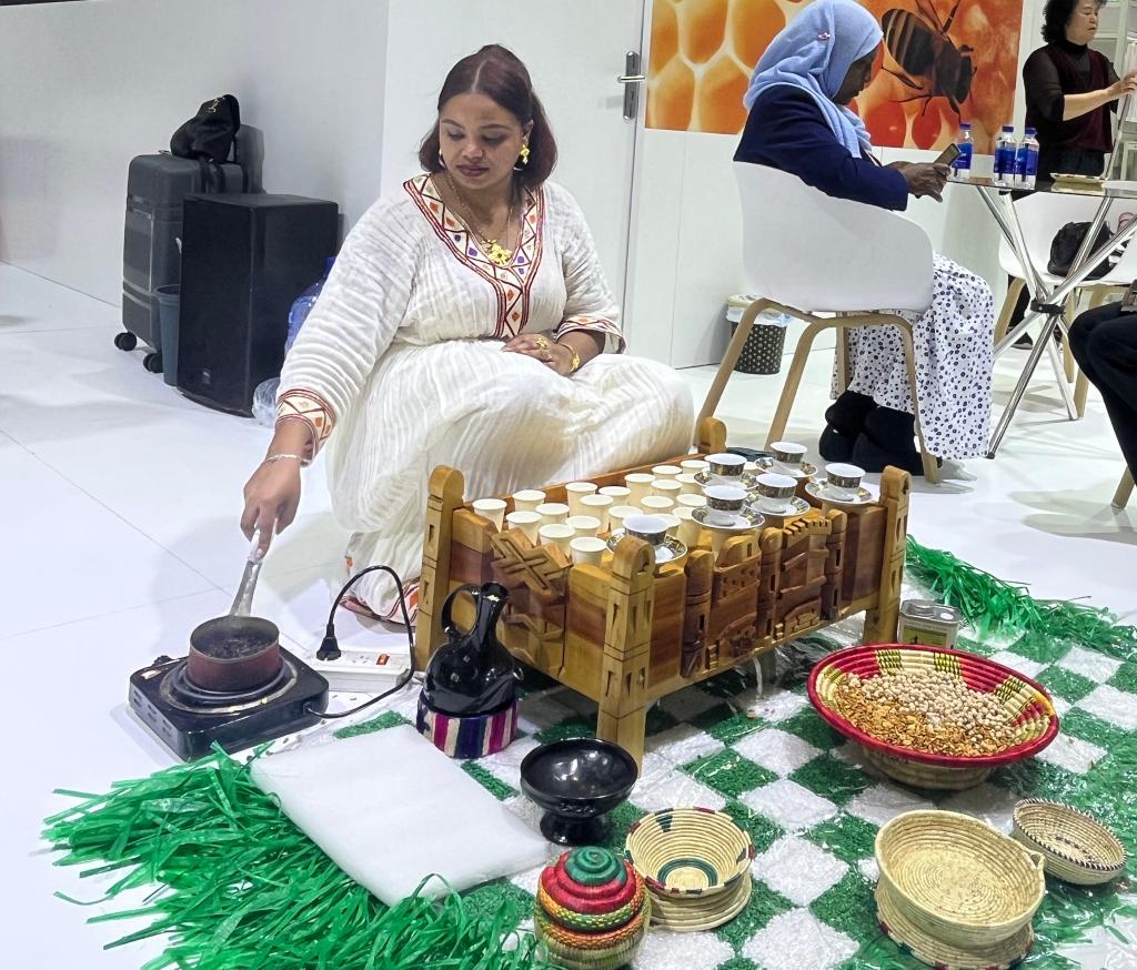 在埃塞俄比亞國家館展區(qū),埃塞俄比亞咖啡師在現(xiàn)場烘焙咖啡豆,展示當?shù)乜Х任幕?。(受訪者供圖)