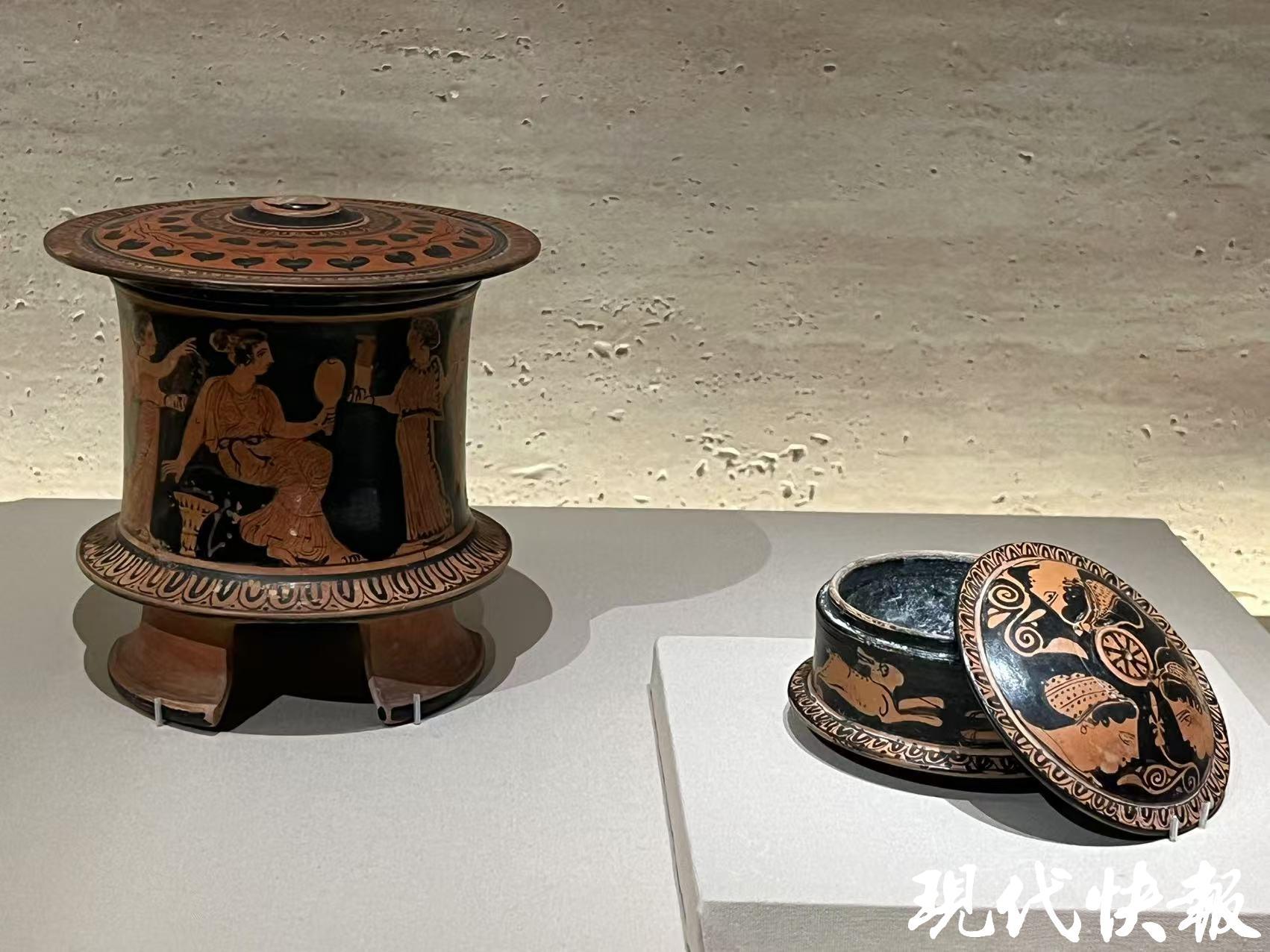 “美的多元——古希臘的藝術(shù)與生活”中展出的黑底紅畫(huà)帶蓋化妝盒