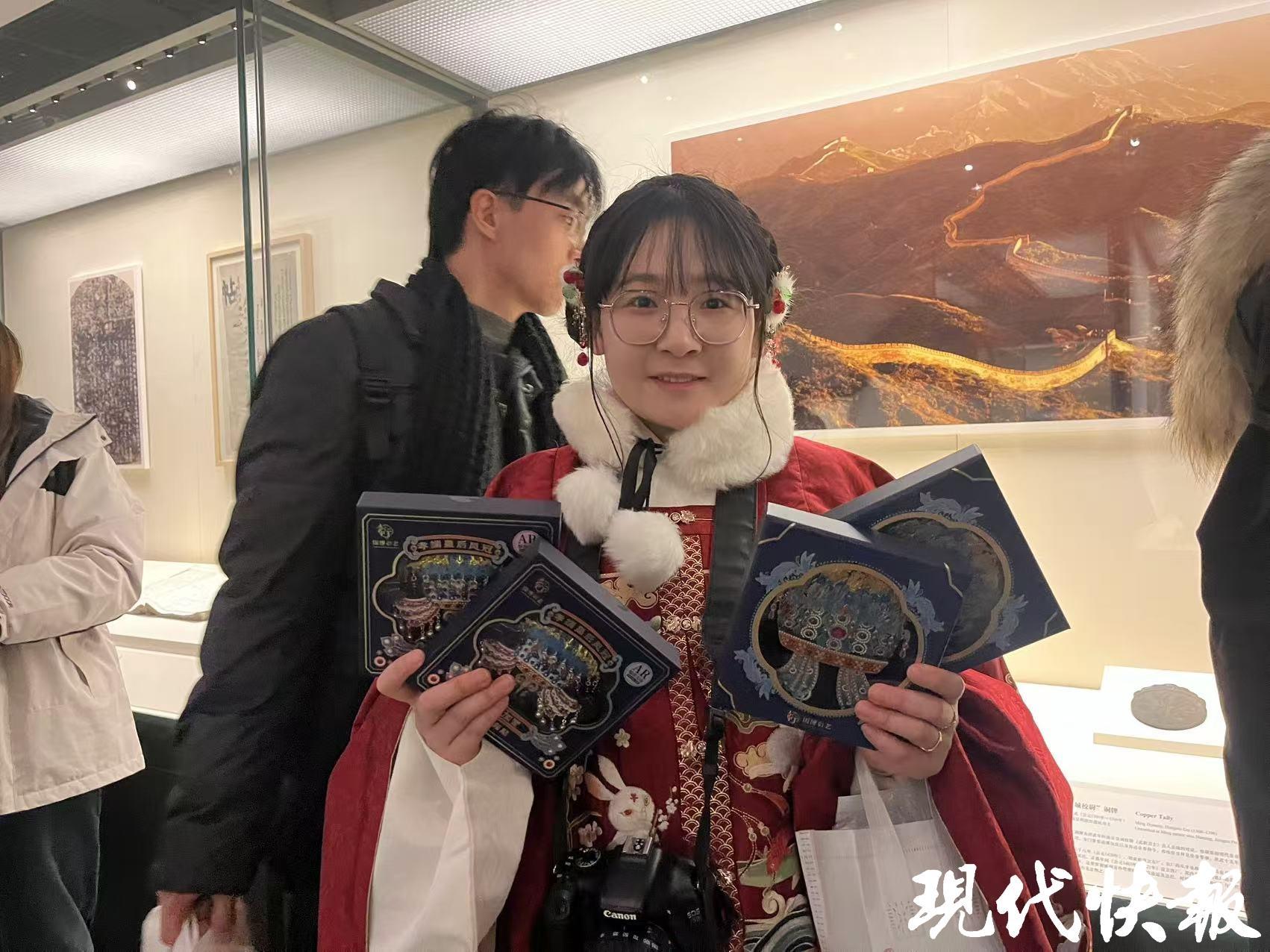 游客帶著冰箱貼來(lái)和文物打卡合影