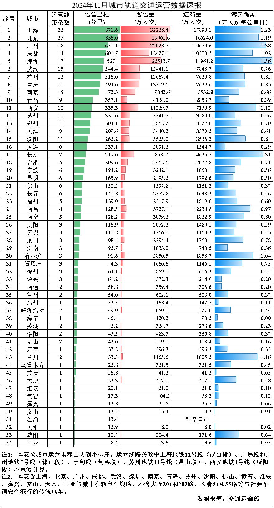交通運輸部發(fā)布消息,2024年11月,31個?。ㄗ灾螀^(qū)、直轄市)和新疆生產(chǎn)建設(shè)兵團共有54個城市開通運營城市軌道交通線路313條,運營里程10522.1公里,實際開行列車340萬列次,完成客運量27.1億人次,進站量16.2億人次。11月份,客運量環(huán)比減少0.6億人次,降低2.2%,同比增加1.3億人次,增長5.2%。11月份全國總運營里程的平均客運強度為0.860萬人次每公里日,環(huán)比增長0.8%,同比增長1.9%。