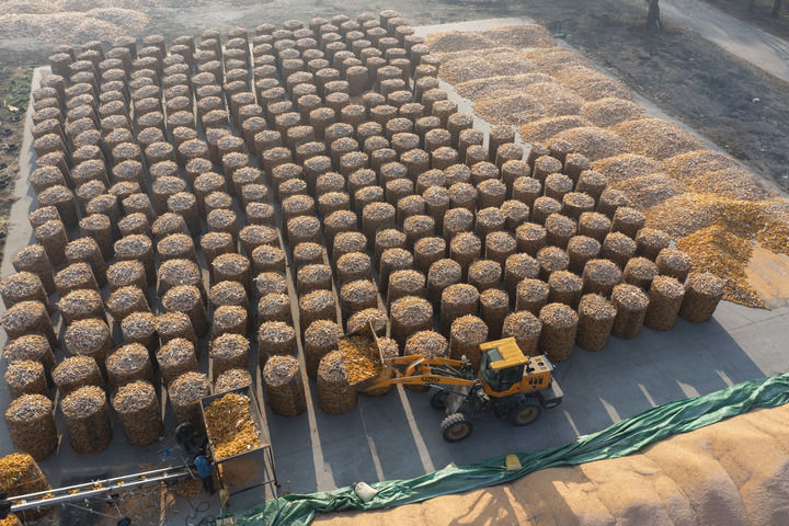 2024年11月13日,在黑龍江省肇東市一處秋糧晾曬場,海城雙麗現(xiàn)代農機專業(yè)合作社的農民駕駛農機堆放玉米(無人機照片)。新華社記者 謝劍飛 攝