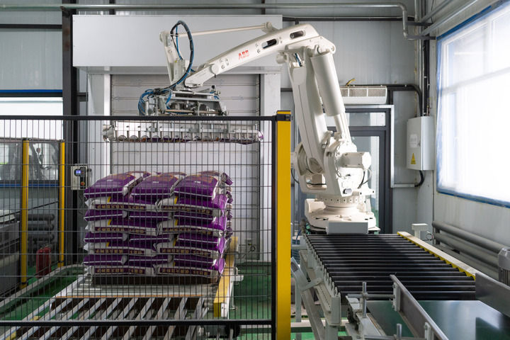 2024年3月29日,黑龍江省黑河市五大連池市一家農業(yè)科技企業(yè)的機械臂在車間內碼放包裝好的大豆種子。新華社記者 謝劍飛 攝
