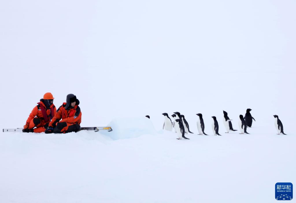 2024年12月8日,第41次南極考察隊(duì)員吸引了企鵝前來(lái)“圍觀”。 新華社記者 黃韜銘 攝