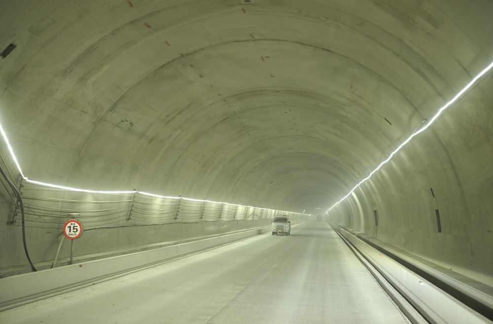這是一次前所未有的駕駛體驗,隧道足可容納兩車并行,路面平坦。隧道內(nèi)部,LED燈帶照亮前路,去除幾分幽深神秘。每隔百米左右,就有通向中導洞的通道,遇到施工堵路,也可以很快調(diào)整路線。