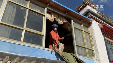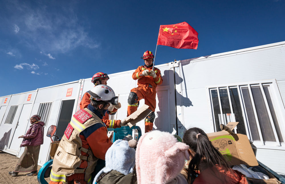 在定日縣措果鄉(xiāng)野江村,消防員在活動(dòng)板房上安置國(guó)旗(1月13日攝)。(新華社記者 丁增尼達(dá) 攝)