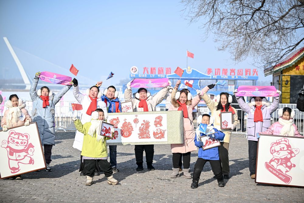 啦啦操、快閃合唱、街頭器樂演奏、國標(biāo)舞、冰雕制作……沿途,豐富多彩的群眾活動營造出滿滿氛圍感。在五星紅旗的掩映下,濱洲鐵路橋煥然一新,高校大學(xué)生置身大型亞冬會主題畫框,合唱《我和我的祖國》,留下精彩一瞬。