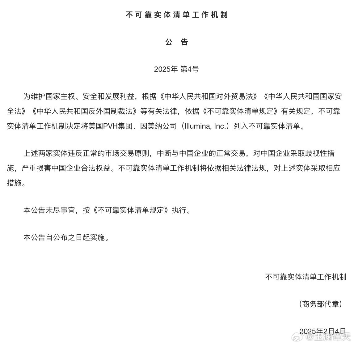 為維護國家主權、安全和發(fā)展利益,根據《中華人民共和國對外貿易法》《中華人民共和國國家安全法》《中華人民共和國反外國制裁法》等有關法律,依據《不可靠實體清單規(guī)定》有關規(guī)定,不可靠實體清單工作機制決定將美國PVH集團、因美納公司(Illumina, Inc.)列入不可靠實體清單。