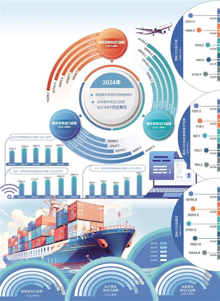 商務部數(shù)據(jù)顯示,2024年我國服務進出口總額達7.5萬億元人民幣,同比增長14.4%,服務貿(mào)易規(guī)模首次突破1萬億美元,再創(chuàng)歷史新高。我國服務貿(mào)易實現(xiàn)了令人矚目的快速增長,展示了經(jīng)濟發(fā)展的活力和韌性,背后是多個領域的協(xié)同發(fā)力。