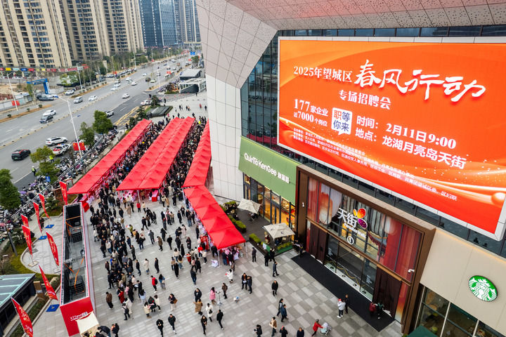 這是2025年2月11日在湖南省長沙市望城區(qū)龍湖月亮島天街商場(chǎng)外坪拍攝的招聘會(huì)現(xiàn)場(chǎng)(無人機(jī)照片)。新華社記者 陳思汗 攝
