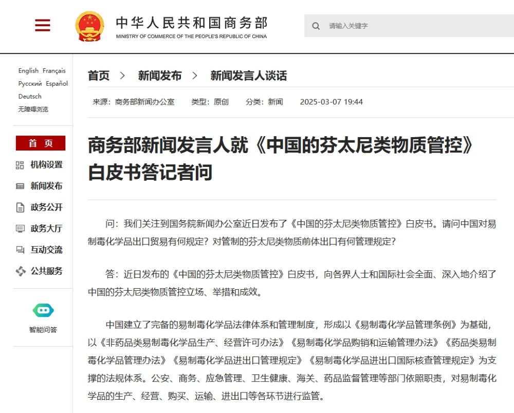 問:我們關注到國務院新聞辦公室近日發(fā)布了《中國的芬太尼類物質管控》白皮書。請問中國對易制毒化學品出口貿(mào)易有何規(guī)定?對管制的芬太尼類物質前體出口有何管理規(guī)定?