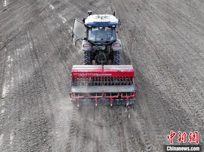 新疆巴音郭楞蒙古自治州庫爾勒市,搭載北斗導(dǎo)航系統(tǒng)的播種機在田間有序作業(yè)。確·胡熱 攝
