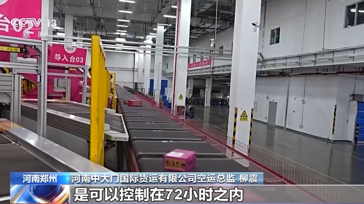 河南中大門國際貨運有限公司空運總監(jiān) 柳震:從國內工廠提貨,到整個航班在境外口岸落地,我們整體的時效是可以控制在72小時之內,完全符合高效運轉的時效要求。