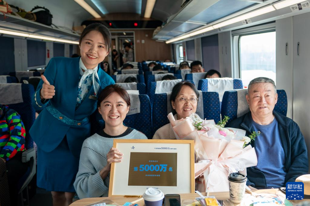 3月28日,中老鐵路第5000萬(wàn)名旅客孫怡薇(前右三)與父母及乘務(wù)員在列車(chē)上合影留念。